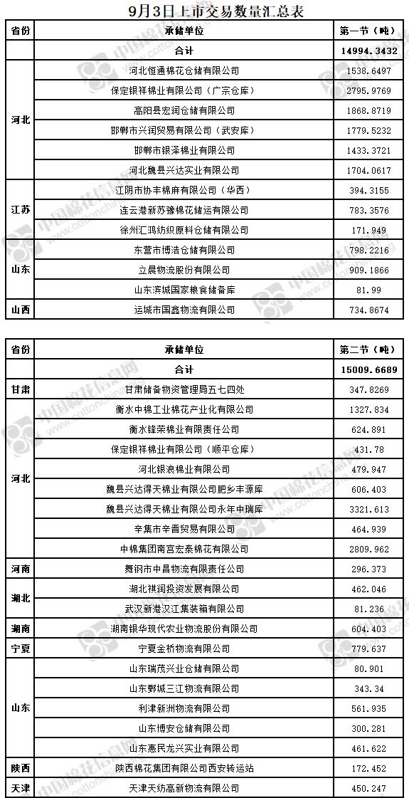 4、保定銀祥棉業(yè)有限公司(廣宗倉(cāng)庫(kù))、邯鄲市興潤(rùn)貿(mào)易有限公司(武安庫(kù))、河北魏縣興達(dá)實(shí)業(yè)有限公司、立晨物流股份有限公司、運(yùn)城市國(guó)鑫物流有限公司、東營(yíng)市博浩倉(cāng)儲(chǔ)有限公司(包含部分包檢)、高陽(yáng)縣宏潤(rùn)倉(cāng)儲(chǔ)有限公司、河北恒通棉花倉(cāng)儲(chǔ)有限公司、江陰市協(xié)豐棉麻有限公司(華西)、連云港新蘇豫棉花儲(chǔ)運(yùn)有限公司、邯鄲市銀澤棉業(yè)有限公司為實(shí)施按批抽樣方式檢驗(yàn)的承儲(chǔ)庫(kù),由于掛牌較為集中,請(qǐng)買方妥善協(xié)商安排出庫(kù)。