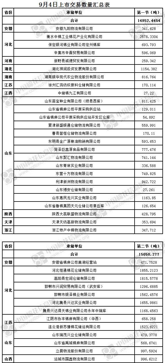 9月4日兩節(jié)共計(jì)輪出儲備棉30002.7224噸。第一節(jié)銷售儲備棉14952.4454噸,其中需要倒垛出庫84捆。第二節(jié)銷售儲備棉15050.277噸,其中需要倒垛出庫45捆。