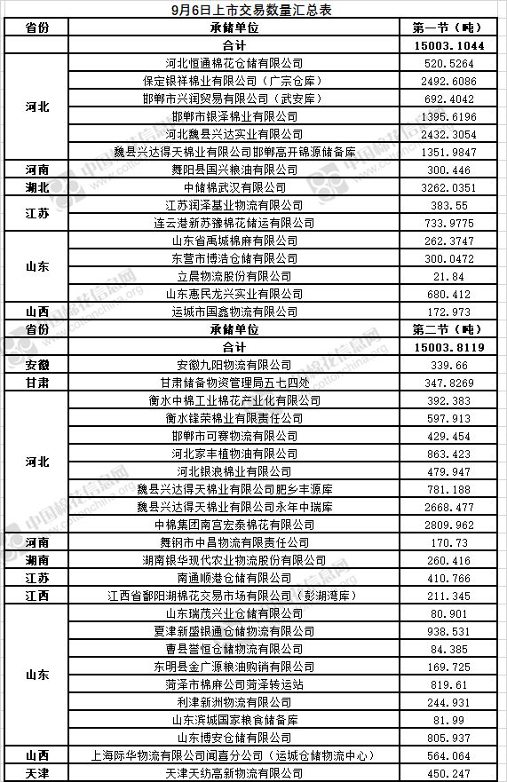 3、保定銀祥棉業(yè)有限公司(廣宗倉庫)、邯鄲市興潤貿(mào)易有限公司(武安庫)、河北魏縣興達(dá)實(shí)業(yè)有限公司、東營市博浩倉儲有限公司(包含部分包檢)、山東省禹城棉麻有限公司、中儲棉武漢有限公司、魏縣興達(dá)得天棉業(yè)有限公司邯鄲高開錦源儲備庫、河北恒通棉花倉儲有限公司、連云港新蘇豫棉花儲運(yùn)有限公司、邯鄲市銀澤棉業(yè)有限公司為實(shí)施按批抽樣方式檢驗(yàn)的承儲庫,由于掛牌較為集中,請買方妥善協(xié)商安排出庫。