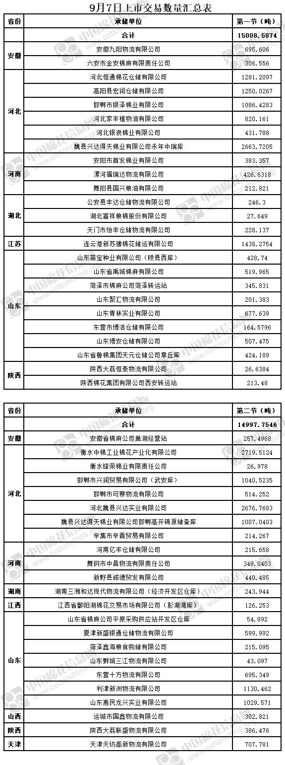 5、河北魏縣興達(dá)實(shí)業(yè)有限公司、邯鄲市興潤貿(mào)易有限公司(武安庫)、山東省棉麻公司平原采購供應(yīng)站開發(fā)區(qū)倉庫、魏縣興達(dá)得天棉業(yè)有限公司邯鄲高開錦源儲備庫、舞鋼市中昌物流有限責(zé)任公司(含部分包檢)、安徽省棉麻公司巢湖經(jīng)營站為實(shí)施按批抽樣方式檢驗(yàn)的承儲庫,由于掛牌較為集中,請買方妥善協(xié)商安排出庫。