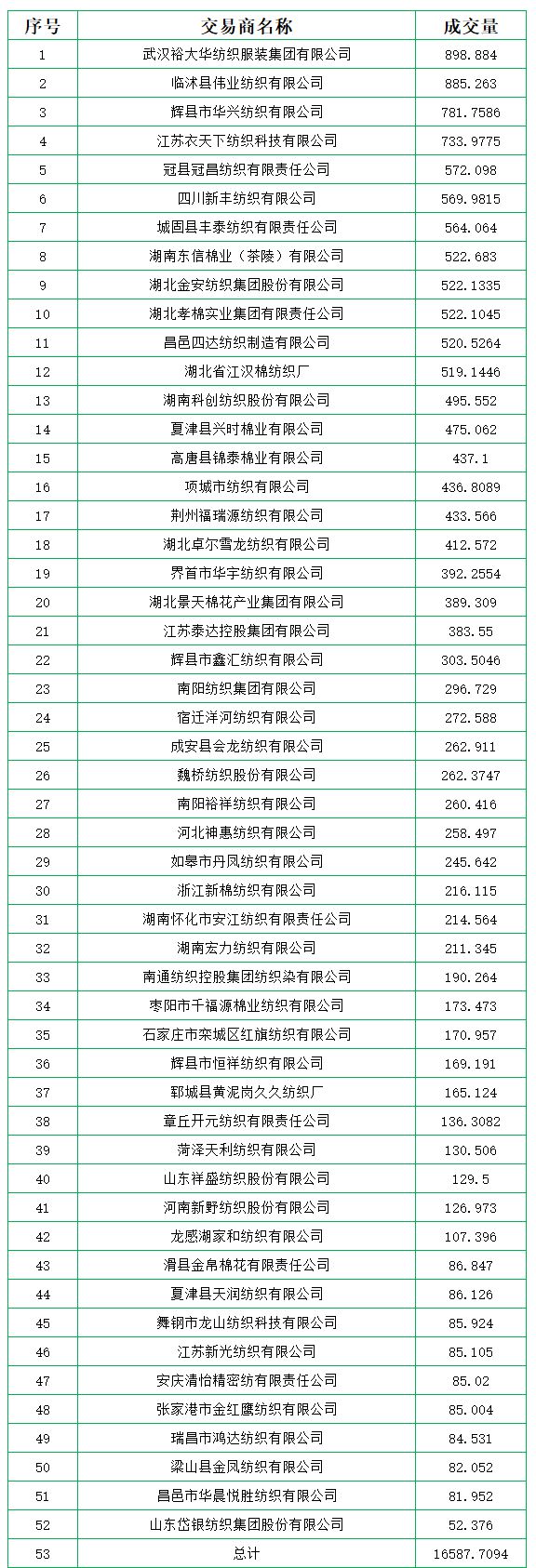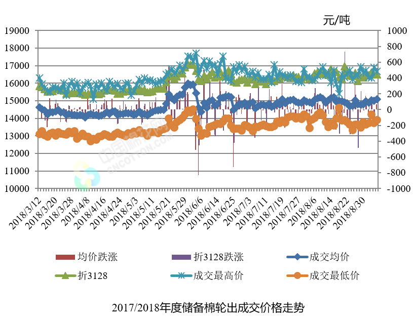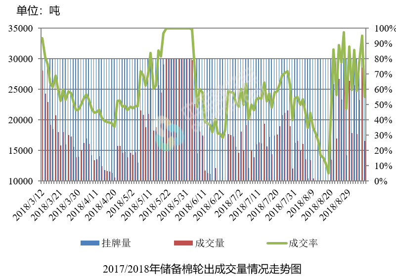 9月6日儲(chǔ)備棉輪出銷售資源30006.9163噸,實(shí)際成交16587.7094噸,成交率55.28%。平均成交價(jià)格15082元/噸(較前一日上漲68元/噸);折3128價(jià)格16489元/噸(較前一日下跌4元/噸)。