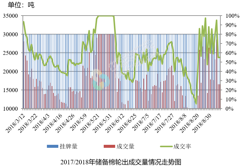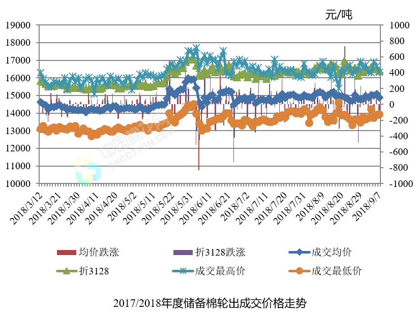 9月7日儲備棉輪出銷售資源30006.342噸,實(shí)際成交21611.8971噸,成交率72.02%。平均成交價格14895元/噸(較前一日下跌187元/噸);折3128價格16417元/噸(較前一日下跌72元/噸)。