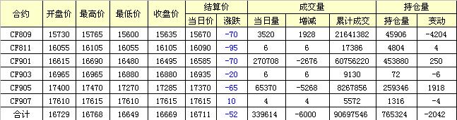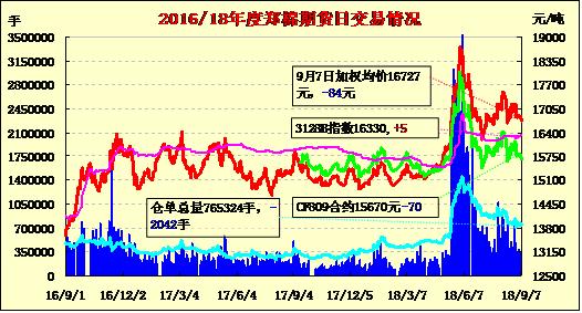 9月7日隔夜鄭棉沖高下滑,今日盤中震蕩走低,午后略有反彈,日線形成小陰線。日內(nèi)成交量變化不大,持倉量略有增加。基本面情況:周三美國德州南部部分多云高溫,近期預(yù)計有40-80%的概率出現(xiàn)雷暴天氣。未來幾天可能有小雨,將使戶外作業(yè)受阻。但由于籽棉庫存相對充足,軋花廠將正常開工。西德州大部多云低溫,周二出現(xiàn)局部暴風(fēng)雨天氣,近期預(yù)計有50-80%的概率出現(xiàn)雷暴天氣,將帶來少量降雨。