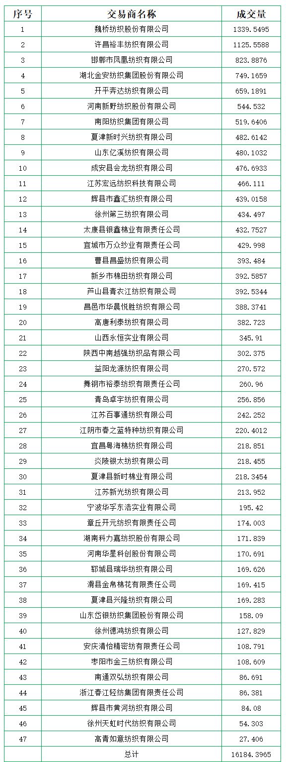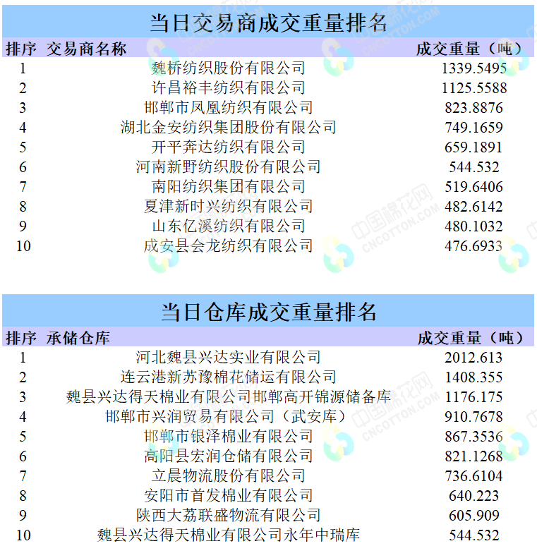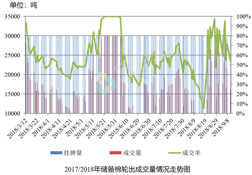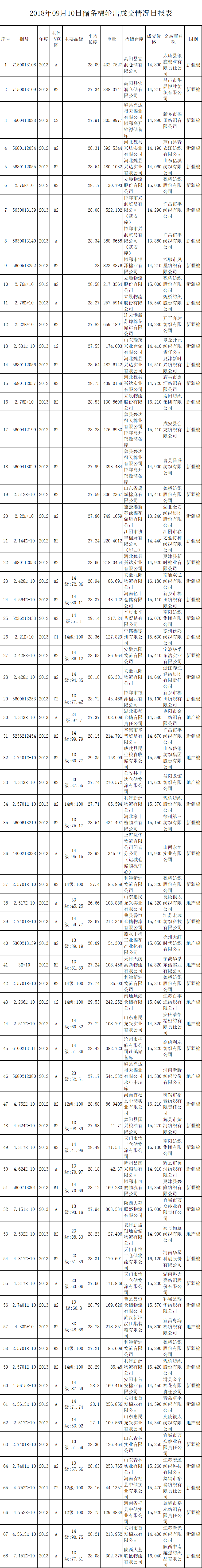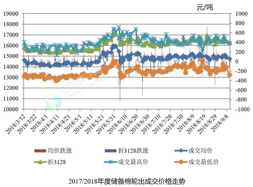 9月10日儲(chǔ)備棉輪出銷售資源30000.4175噸,實(shí)際成交16184.3965噸,成交率53.95%。平均成交價(jià)格14748元/噸(較前一日下跌147元/噸);折3128價(jià)格16304元/噸(較前一日下跌113元/噸)。