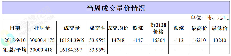 累計(jì)情況:截至9月10日,累計(jì)計(jì)劃出庫384.1萬噸,累計(jì)出庫成交224.1萬噸,成交率為58%;成交最高價(jià)17700元/噸,最低價(jià)12700元/噸。