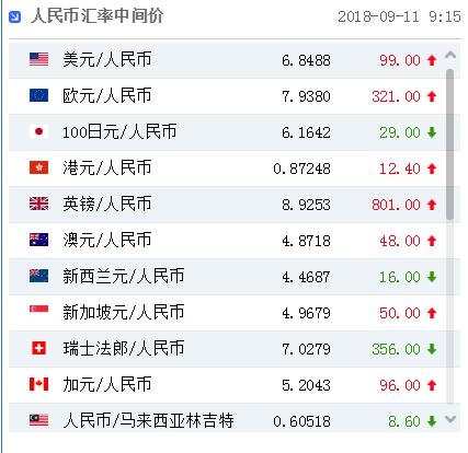 中國人民銀行授權(quán)中國外匯交易中心公布,2018年9月11日銀行間外匯市場人民幣匯率中間價為:1美元對人民幣6.8488元,1歐元對人民幣7.9380元,100日元對人民幣6.1642元,1港元對人民幣0.87248元,1英鎊對人民幣8.9253元,1澳大利亞元對人民幣4.8718元,1新西蘭元對人民幣4.4687元,1新加坡元對人民幣4.9679元,1瑞士法郎對人民幣7.0279元,1加拿大元對人民幣5.2043元,人民幣1元對0.60518馬來西亞林吉特,人民幣1元對10.2980俄羅斯盧布,人民幣1元對2.2183南非蘭特,人民幣1元對164.74韓元,人民幣1元對0.53631阿聯(lián)酋迪拉姆,人民幣1元對0.54770沙特里亞爾,人民幣1元對40.9136匈牙利福林,人民幣1元對0.54303波蘭茲羅提,人民幣1元對0.9393丹麥克朗,人民幣1元對1.3231瑞典克朗,人民幣1元對1.2249挪威克朗,人民幣1元對0.94444土耳其里拉,人民幣1元對2.8144墨西哥比索,人民幣1元對4.7903泰銖。