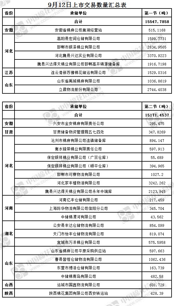 9月12日兩節(jié)共計(jì)輪出儲(chǔ)備棉30719.2395噸。第一節(jié)銷售儲(chǔ)備棉15547.7858噸,其中需要倒垛出庫(kù)41捆。第二節(jié)銷售儲(chǔ)備棉15171.4537噸,其中需要倒垛出庫(kù)74捆。