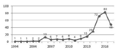 相比而言,我國(guó)麻纖維復(fù)合材料的研究工作起步較晚。據(jù)了解,我國(guó)麻纖維復(fù)合材料的研究始于1994年。專利數(shù)據(jù)顯示,在1994年至2012年間,該技術(shù)的專利申請(qǐng)量較少,不超過(guò)13件,但呈逐步增加趨勢(shì),2006年達(dá)到一個(gè)小峰值,之后到2007年專利申請(qǐng)量出現(xiàn)了一個(gè)較小的回落。筆者分析,出現(xiàn)這種情況,主要原因是四川宜賓絲麗雅股份有限公司在2006年圍繞含有麻纖維混合復(fù)合纖維素新型漿粕技術(shù)提交了8件專利申請(qǐng)。在2012年至2016年間,該技術(shù)的專利申請(qǐng)呈逐年增加態(tài)勢(shì),尤其是2015年比2014年的專利申請(qǐng)量翻了一番。近幾年,隨著環(huán)保要求的提高,很多企業(yè)在前期研究的基礎(chǔ)上進(jìn)行了技術(shù)改進(jìn),提交了一些有關(guān)麻纖維復(fù)合材料的專利申請(qǐng)。不過(guò),由于2017年有些專利申請(qǐng)到檢索截止日還未公開(kāi),統(tǒng)計(jì)可能不完全。