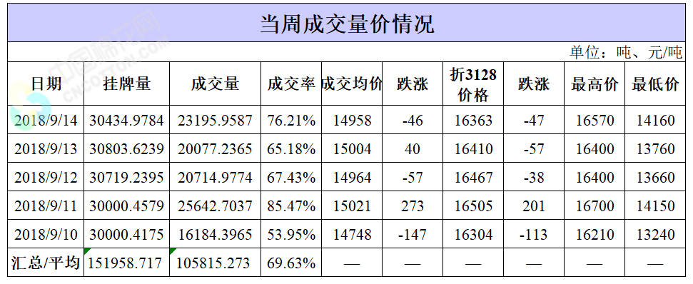 累計情況:截至9月14日,累計計劃出庫396.3萬噸,累計出庫成交233.1萬噸,成交率為59%;成交最高價17700元/噸,最低價12700元/噸。