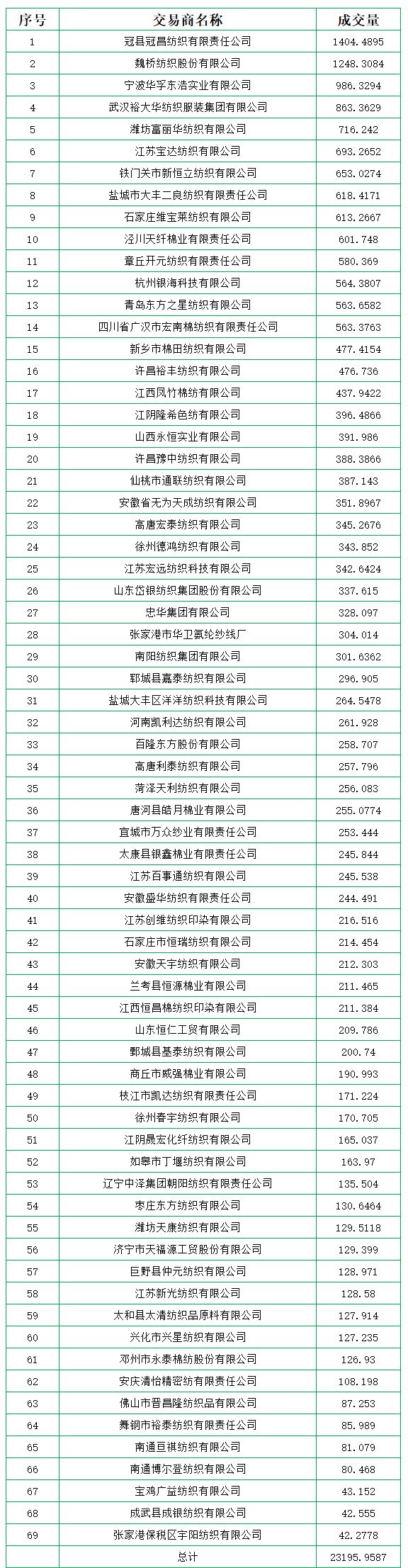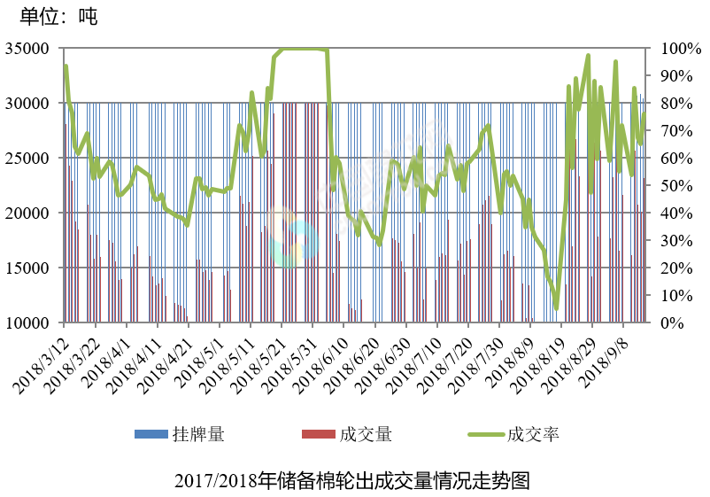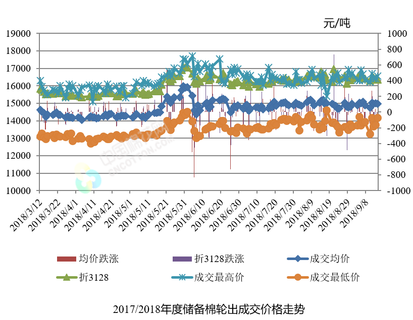 9月14日儲備棉輪出銷售資源30434.9784噸,實際成交23195.9587噸,成交率76.21%。平均成交價格14958元/噸(較前一日下跌46元/噸);折3128價格16363元/噸(較前一日下跌47元/噸)。