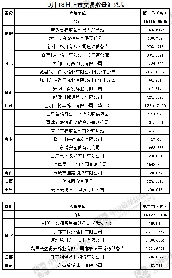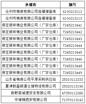 4、江陰市協(xié)豐棉麻有限公司(華西),魏縣興達得天棉業(yè)有限公司肥鄉(xiāng)豐源庫部分,安徽省棉麻公司巢湖經(jīng)營站部分為實施按批抽樣方式檢驗的承儲庫,由于掛牌較為集中,請買方妥善協(xié)商安排出庫。