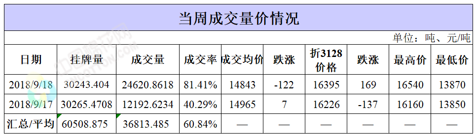 累計(jì)情況:截至9月18日,累計(jì)計(jì)劃出庫(kù)402.3萬(wàn)噸,累計(jì)出庫(kù)成交236.8萬(wàn)噸,成交率為59%;成交最高價(jià)17700元/噸,最低價(jià)12700元/噸。