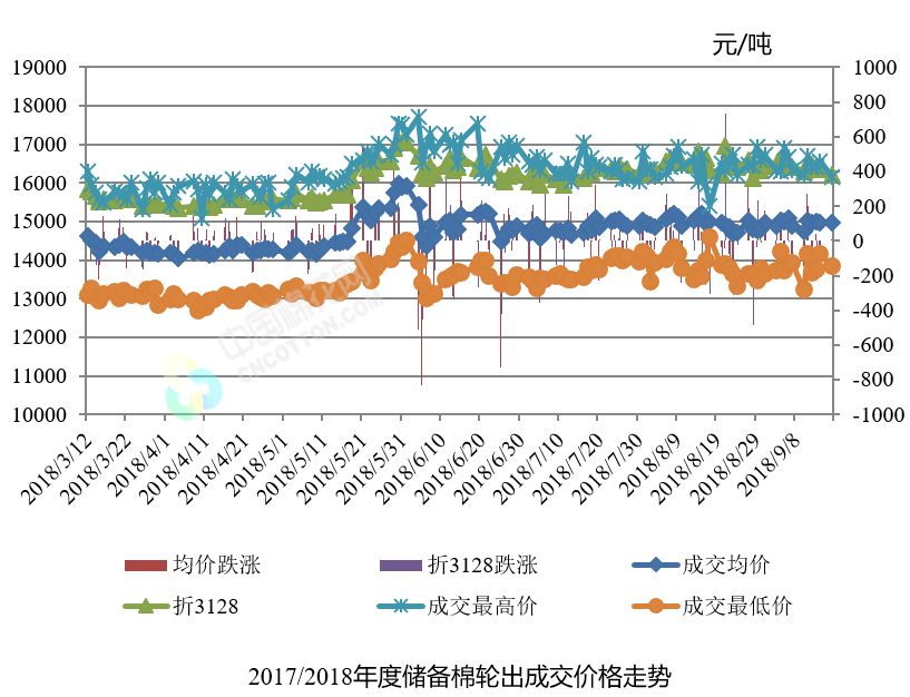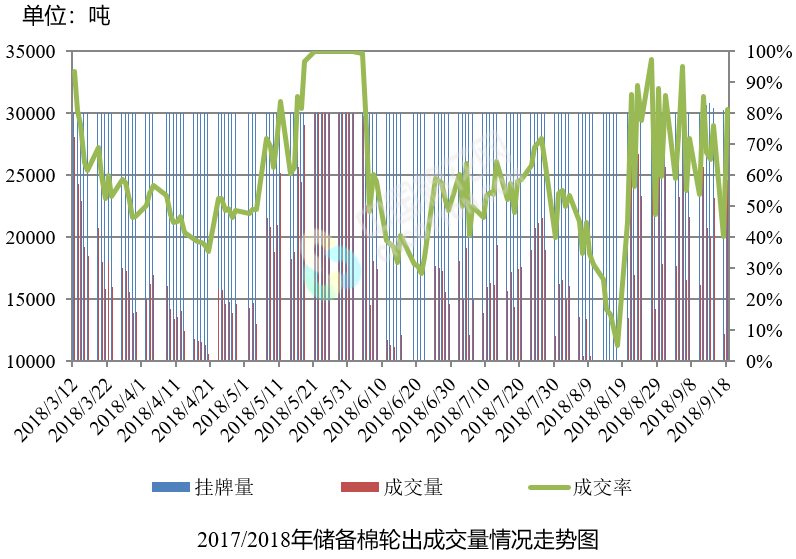 9月18日儲(chǔ)備棉輪出銷(xiāo)售資源30243.404噸,實(shí)際成交24620.8618噸,成交率81.41%。平均成交價(jià)格14843元/噸(較前一日下跌122元/噸);折3128價(jià)格16395元/噸(較前一日上漲169元/噸)。