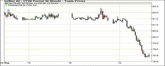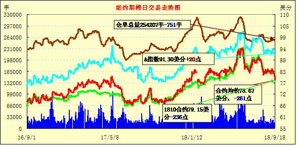 18日紐約期棉市場(chǎng)全面大幅收跌。1812合約結(jié)算價(jià)78.52美分,跌279點(diǎn);1903合約結(jié)算價(jià)79.13美分,跌251點(diǎn);1905合約結(jié)算價(jià)79.89美分,跌231點(diǎn)。其他合約下跌100-216點(diǎn)不等。當(dāng)日12月合約小幅高開,整日交易呈下行態(tài)勢(shì)。開盤后圍繞81.50美分一線窄幅震蕩運(yùn)行,后賣盤入場(chǎng),市場(chǎng)承壓走低,后短暫維持在81.50-81.00美分區(qū)間,因缺乏有利支撐,后跌幅加深,最終以大幅下跌收盤。為自4月24日以來12月合約最低點(diǎn)。美國政府宣布將對(duì)2000億美元中國商品加征關(guān)稅,于9月24日正式開始實(shí)施加征10%,于2019年1月1日起開始加征25%。中美貿(mào)易爭(zhēng)端愈演愈烈的態(tài)勢(shì)引發(fā)市場(chǎng)擔(dān)憂,基金減持多單。外圍美元指數(shù)上漲,小麥期貨上漲,玉米和大豆期貨下跌。美股收盤普漲,標(biāo)普接近新高。