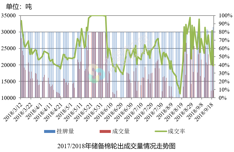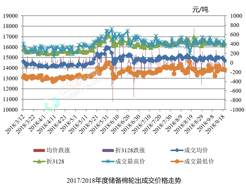 9月19日儲備棉輪出銷售資源31521.2607噸,實際成交12306.7724噸,成交率39.04%。平均成交價格14725元/噸(較前一日下跌118元/噸);折3128價格16354元/噸(較前一日下跌41元/噸)。