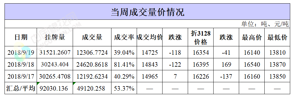 累計情況:截至9月19日,累計計劃出庫405.5萬噸,累計出庫成交238萬噸,成交率為59%;成交最高價17700元/噸,最低價12700元/噸。