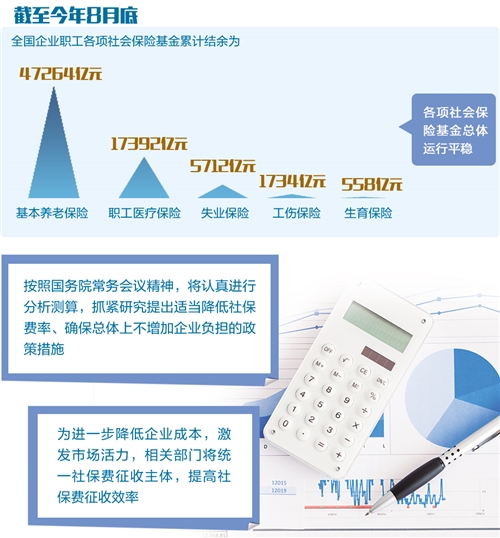 社保費率如進一步降低,是否會影響到社保基金運行?從各項社保基金運行情況看,截至今年8月底,全國企業(yè)職工基本養(yǎng)老保險、職工醫(yī)療保險、失業(yè)保險、工傷保險、生育保險基金累計結(jié)余分別為47264億元、17392億元、5712億元、1734億元、558億元,各項社會保險基金總體運行平穩(wěn)。