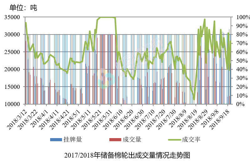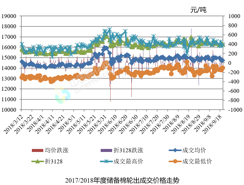 9月20日儲備棉輪出銷售資源30061.528噸,實際成交21688.0573噸,成交率72.15%。平均成交價格14742元/噸(較前一日上漲17元/噸);折3128價格16291元/噸(較前一日下跌63元/噸)。