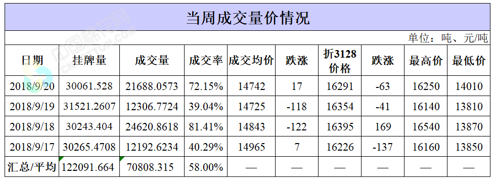 累計情況:截至9月20日,累計計劃出庫408.5萬噸,累計出庫成交240.2萬噸,成交率為59%;成交最高價17700元/噸,最低價12700元/噸。