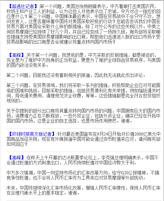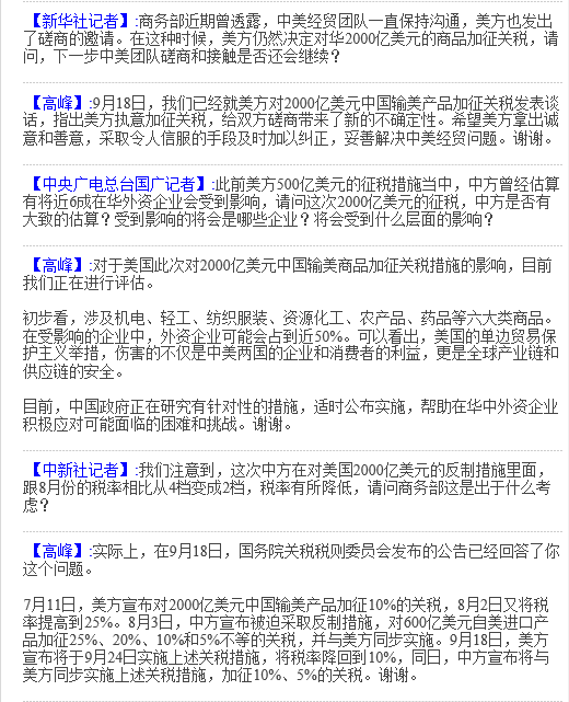 中國(guó)商務(wù)部新聞發(fā)言人高峰20日稱,美國(guó)對(duì)2000億美元中國(guó)商品加征關(guān)稅措施涉及機(jī)電、輕工、紡織服裝、藥品等六大品類(lèi),在受影響企業(yè)中,外企占比50%。美方此舉傷害的不僅是中美兩國(guó)企業(yè)和消費(fèi)者利益,還傷害全球產(chǎn)業(yè)鏈安全。目前中國(guó)正在研究有針對(duì)性的措施幫助企業(yè)應(yīng)對(duì)可能的困難。