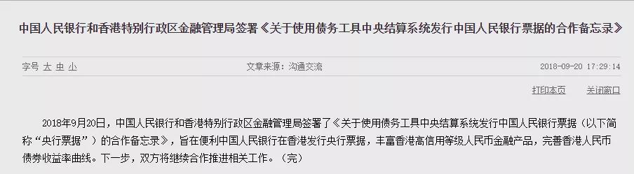 9月20日晚間,央行在官網(wǎng)宣布,已與香港特別行政區(qū)金融管理局簽署合作備忘錄,以便利央行票據(jù)在香港發(fā)行,豐富香港高信用等級人民幣金融產(chǎn)品,完善香港人民幣債券收益率曲線。