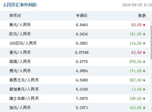 中國人民銀行授權中國外匯交易中心公布,2018年9月25日銀行間外匯市場人民幣匯率中間價為:1美元對人民幣6.8440元,1歐元對人民幣8.0434元,100日元對人民幣6.0682元,1港元對人民幣0.87598元,1英鎊對人民幣8.9775元,1澳大利亞元對人民幣4.9654元,1新西蘭元對人民幣4.5466元,1新加坡元對人民幣5.0109元,1瑞士法郎對人民幣7.0979元,1加拿大元對人民幣5.2873元,人民幣1元對0.60319馬來西亞林吉特,人民幣1元對9.6120俄羅斯盧布,人民幣1元對2.0988南非蘭特,人民幣1元對163.15韓元,人民幣1元對0.53656阿聯(lián)酋迪拉姆,人民幣1元對0.54791沙特里亞爾,人民幣1元對40.2064匈牙利福林,人民幣1元對0.53419波蘭茲羅提,人民幣1元對0.9272丹麥克朗,人民幣1元對1.2850瑞典克朗,人民幣1元對1.1889挪威克朗,人民幣1元對0.89903土耳其里拉,人民幣1元對2.7705墨西哥比索,人民幣1元對4.7357泰銖。