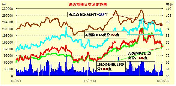 9月25日紐約期棉市場全面收漲。1812合約結(jié)算價(jià)78.99美分,漲41點(diǎn);1903合約結(jié)算價(jià)79.44美分,漲48點(diǎn);1905合約結(jié)算價(jià)80.09美分,漲50點(diǎn)。其他合約上漲41-51點(diǎn)不等。當(dāng)日12月合約平穩(wěn)開盤,開盤后交易重心呈震蕩運(yùn)行態(tài)勢,后買盤入場,市場受支撐走高,雖盤中有所回落,但在買盤支撐下,最終扭轉(zhuǎn)前一日跌勢,以漲勢收盤。據(jù)北卡棉農(nóng)反饋,受颶風(fēng)帶來的大風(fēng)、強(qiáng)降雨和洪水影響,北卡中部和中南部棉區(qū)棉花受損量可能達(dá)30%。由于季風(fēng)降雨量偏少,印度棉株生長狀況可能受到一定影響。但由于中國對(duì)印度棉需求量可能出現(xiàn)較大增幅,對(duì)棉價(jià)形成支撐。外圍美元指數(shù)下跌,小麥期貨下跌,大豆和玉米期貨上漲。美股收盤漲跌不一,道指和標(biāo)普再度收跌,納指維持漲勢。