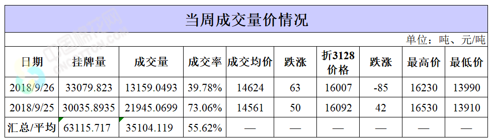 累計情況:截至9月26日,累計計劃出庫417.9萬噸,累計出庫成交244.7萬噸,成交率為59%;成交最高價17700元/噸,最低價12700元/噸。