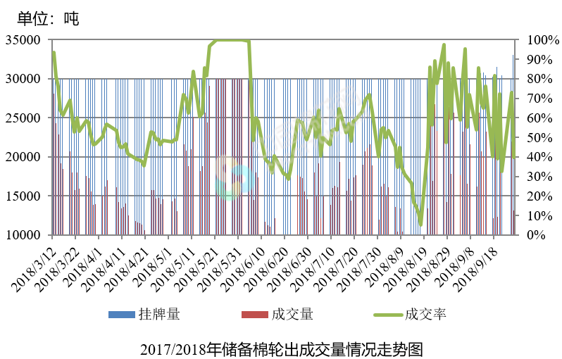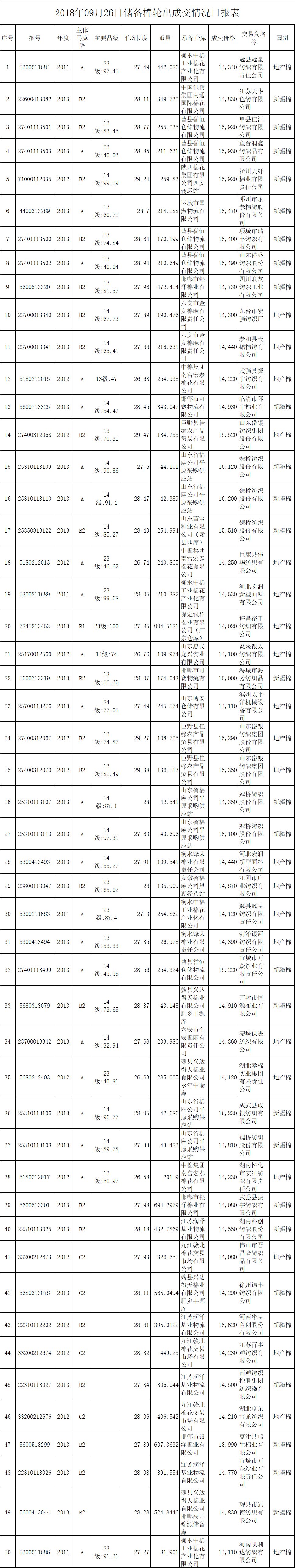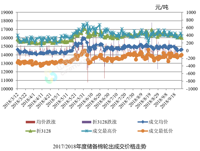 9月26日儲備棉輪出銷售資源33079.823噸,實際成交13159.0493噸,成交率39.78%。平均成交價格14624元/噸(較前一日上漲63元/噸);折3128價格16007元/噸(較前一日下跌85元/噸)。