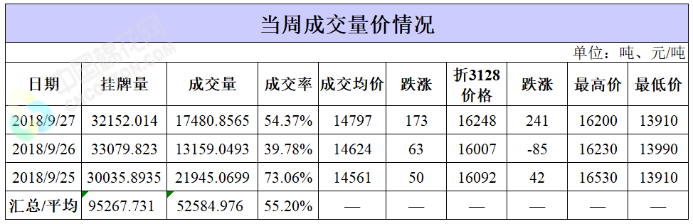 累計(jì)情況:截至9月27日,累計(jì)計(jì)劃出庫(kù)421.1萬(wàn)噸,累計(jì)出庫(kù)成交246.4萬(wàn)噸,成交率為59%;成交最高價(jià)17700元/噸,最低價(jià)12700元/噸。