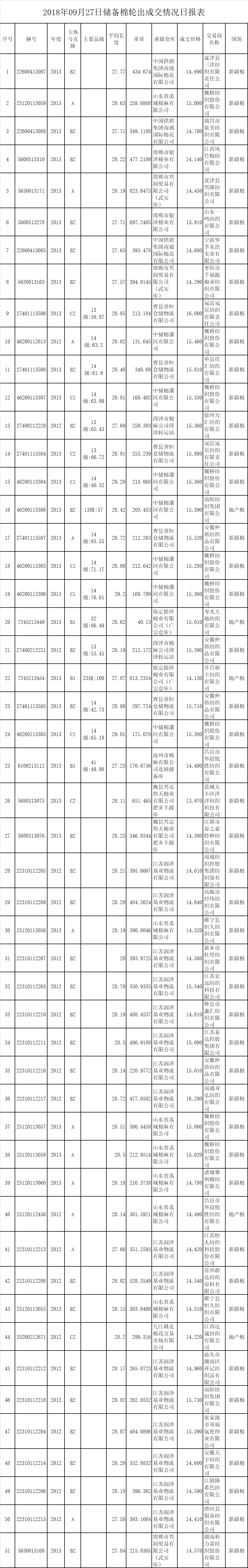 9月27日儲(chǔ)備棉輪出銷售資源32152.014噸,實(shí)際成交17480.8565噸,成交率54.37%。平均成交價(jià)格14797元/噸(較前一日上漲173元/噸);折3128價(jià)格16248元/噸(較前一日上漲241元/噸)。