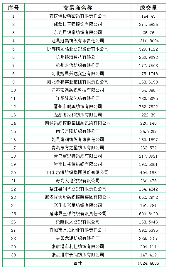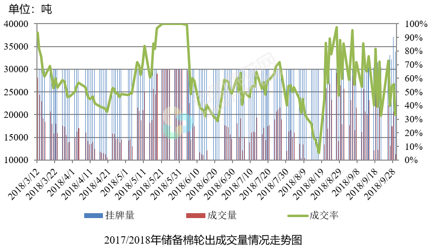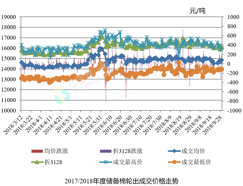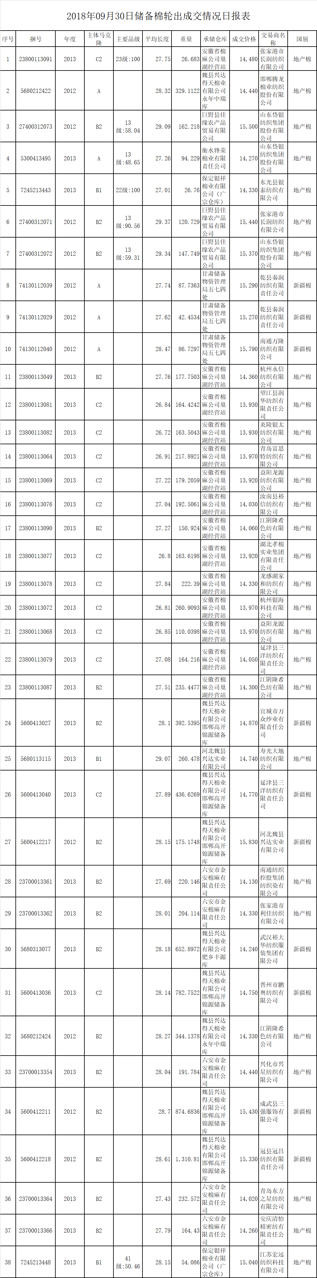 9月30日儲(chǔ)備棉輪出銷售資源30037.8829噸,實(shí)際成交9824.4605噸,成交率32.71%。平均成交價(jià)格14674元/噸(較前一日下跌169元/噸);折3128價(jià)格15853元/噸(較前一日下跌281元/噸)。