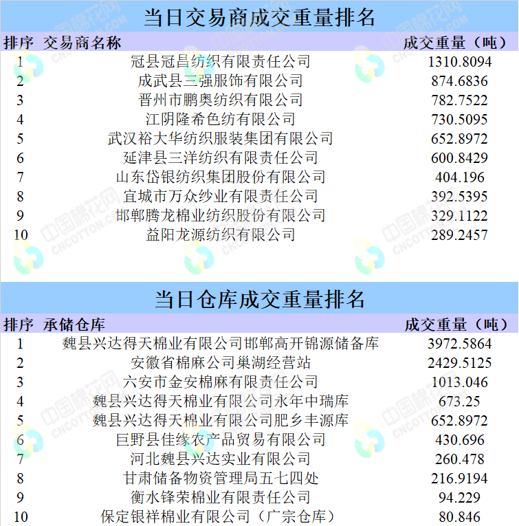 當(dāng)日情況:地產(chǎn)棉成交4982.0575噸,成交率21%,成交均價(jià)14314元/噸,平均加價(jià)53元/噸,最高成交價(jià)15500元/噸,最低成交價(jià)13920元/噸。新疆棉成交4842.403噸,成交率75%,成交均價(jià)15045元/噸,平均加價(jià)262元/噸,最高成交價(jià)15830元/噸,最低成交價(jià)14240元/噸。