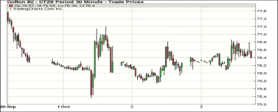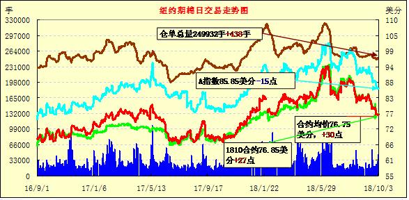 10月3日紐約期棉市場止跌反彈。1812合約結(jié)算價76.46美分,漲27點(diǎn);1903合約結(jié)算價77.20美分,漲28點(diǎn);1905合約結(jié)算價77.92美分,漲22點(diǎn)。當(dāng)日12月合約小幅高開,開盤后交易重心受支撐小幅上行,后受獲利了結(jié)盤壓力市場走低,至當(dāng)日低點(diǎn)76.08美分處買盤發(fā)力,交易重心受支撐上行,后至收盤處雖出現(xiàn)幾次震蕩,但最終仍以小幅上漲收盤。在經(jīng)歷連續(xù)下跌之后,3日期棉市場止跌反彈,但市場普遍仍持悲觀態(tài)度。從持倉量來看,與6月份主力合約價格在90美分一線以上時出現(xiàn)明顯減少。加之新棉上市,短期內(nèi)對價格上行形成壓力。同時,美元走勢強(qiáng)勁,也會對美棉出口造成一定影響。外圍美元指數(shù)上漲,玉米、大豆和小麥期貨下跌。