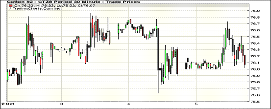 10月5日紐約期棉市場(chǎng)全面收漲。1812合約結(jié)算價(jià)76.10美分,漲10點(diǎn);1903合約結(jié)算價(jià)77.14美分,漲32點(diǎn);1905合約結(jié)算價(jià)77.95美分,漲26點(diǎn)。其他合約上漲21-27點(diǎn)不等。當(dāng)日12月合約平穩(wěn)開(kāi)盤(pán),開(kāi)盤(pán)后維持在76.00-76.20美分區(qū)間窄幅震蕩運(yùn)行,后買(mǎi)盤(pán)發(fā)力,市場(chǎng)受支撐走高,至當(dāng)日高點(diǎn)76.73美分處賣(mài)盤(pán)入場(chǎng),交易重心承壓走低,后至收盤(pán)處雖經(jīng)歷震蕩,市場(chǎng)至較高點(diǎn)有所回落,但仍以漲勢(shì)收盤(pán)。目前市場(chǎng)多持觀望態(tài)度。下周美國(guó)農(nóng)業(yè)部將發(fā)布10月份最新供需預(yù)測(cè),或?qū)⒔o市場(chǎng)提供參考方向。外圍美元指數(shù)下跌,玉米、大豆和小麥期貨上漲。