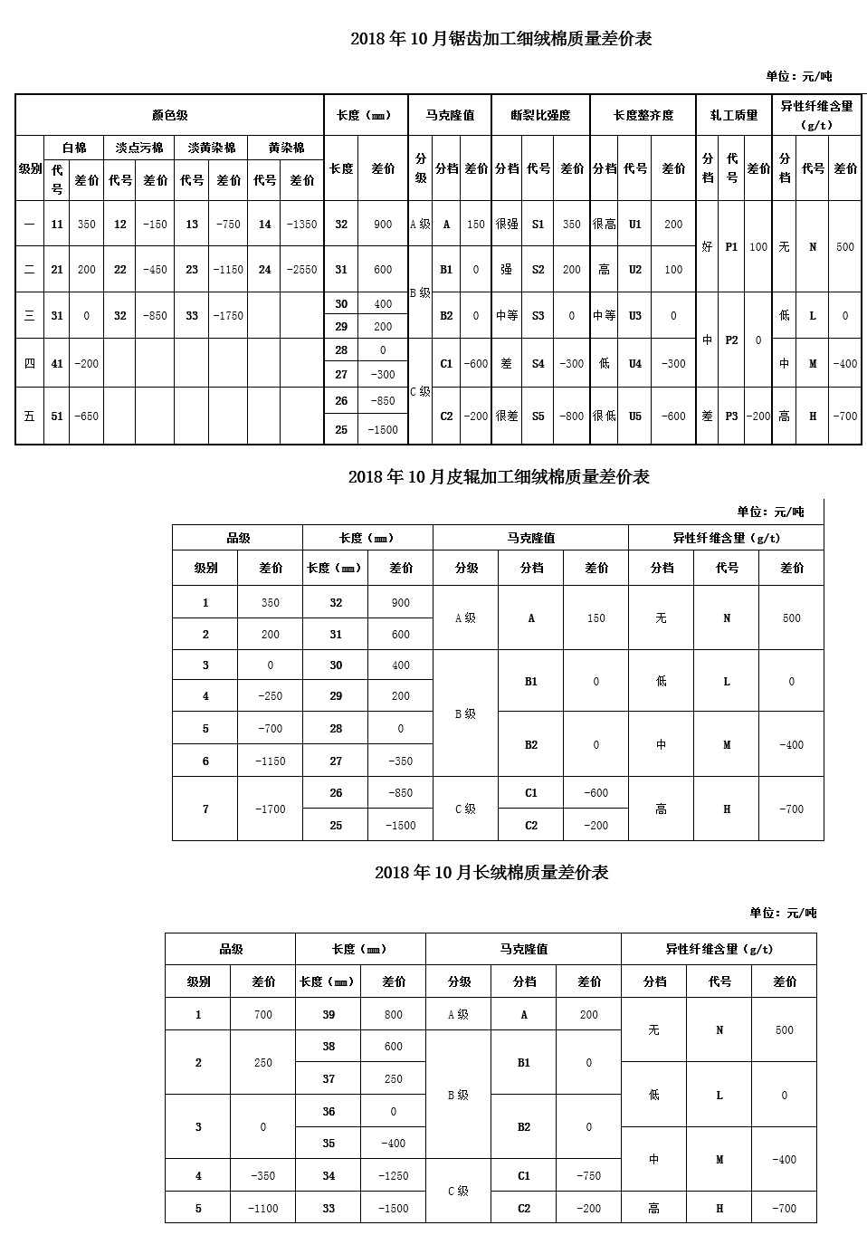 根據(jù)《中國(guó)棉花協(xié)會(huì)國(guó)產(chǎn)棉質(zhì)量差價(jià)表管理辦法》規(guī)定,現(xiàn)正式發(fā)布2018年10月《鋸齒加工細(xì)絨棉質(zhì)量差價(jià)表》、《皮輥加工細(xì)絨棉質(zhì)量差價(jià)表》和《長(zhǎng)絨棉質(zhì)量差價(jià)表》(單位:元/噸)。