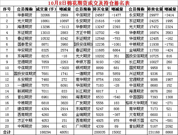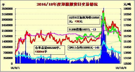 10月8日,國(guó)慶節(jié)期間紐約棉花期貨弱市震蕩,今日鄭棉低開下探,期價(jià)受到多頭逢低買盤支撐回升,日線形成低開陽線。日內(nèi)成交量變化不大,持倉量增加?;久媲闆r:17/18年度3月12日至9月30日,儲(chǔ)備棉輪出累計(jì)成交250.59萬噸,成交率58.12%。國(guó)慶節(jié)期間,新疆棉花收購從開秤初期高位逐漸下滑,手摘棉籽棉收購價(jià)在7.0-7.4元/公斤,機(jī)采棉籽棉收購價(jià)在6.0-6.3元/公斤,在此期間,收購價(jià)運(yùn)行基本保持平穩(wěn)。
