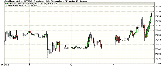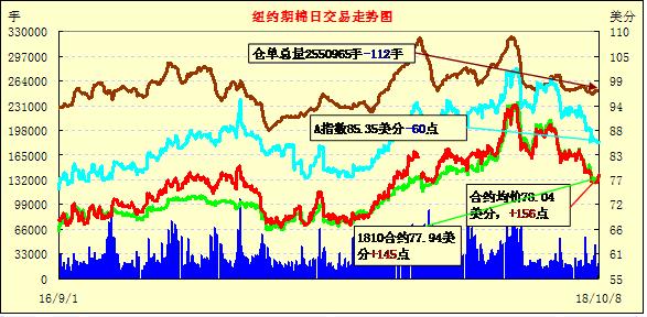 8日紐約期棉市場(chǎng)漲勢(shì)延續(xù)。1812合約結(jié)算價(jià)77.55美分,漲145點(diǎn);1903合約結(jié)算價(jià)78.49美分,漲135點(diǎn);1905合約結(jié)算價(jià)79.21美分,漲126點(diǎn)。其他合約上漲46-113點(diǎn)不等。當(dāng)日12月合約小幅高開(kāi),開(kāi)盤(pán)后交易重心受支撐小幅上行,后買(mǎi)盤(pán)發(fā)力,市場(chǎng)繼續(xù)走高,高點(diǎn)處賣(mài)盤(pán)入場(chǎng),交易重心承壓下行,低點(diǎn)處買(mǎi)盤(pán)入場(chǎng),市場(chǎng)受支撐止跌反彈,最終得以延續(xù)前一日漲勢(shì)。颶風(fēng)Michael預(yù)計(jì)將于周三夜間或周四早間于喬治亞州登陸,強(qiáng)度可能為3級(jí)。有分析人士稱,颶風(fēng)或?qū)⒃斐?0.9-16.3萬(wàn)噸的損失。因哥倫布日假期,8號(hào)紐約期市休市一天。外圍美元指數(shù)上漲,玉米、大豆和小麥期貨下跌。周一美股收盤(pán)漲跌不一,道指收漲,標(biāo)普和納指收跌。