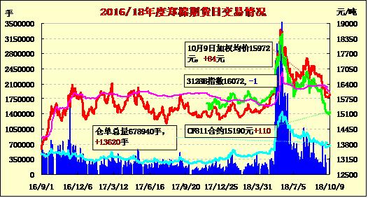 10月9日,周一紐約棉花期貨收漲,隔夜鄭棉沖高,今日早盤下探震蕩,日線形成陰線星。日內(nèi)成交量變化不大,持倉(cāng)量近減遠(yuǎn)增?;久媲闆r:截止到2018年10月8日24點(diǎn),2018棉花年度全國(guó)共有198家棉花加工企業(yè)按照棉花質(zhì)量檢驗(yàn)體制改革方案的要求加工棉花并進(jìn)行公證檢驗(yàn),檢驗(yàn)量達(dá)到204135包,46130萬(wàn)噸。其中新疆:133家加工企業(yè),公證檢驗(yàn)達(dá)142905包,3.2374萬(wàn)噸。內(nèi)地65家加工企業(yè),公證檢驗(yàn)達(dá)61230包,1.3757萬(wàn)噸。