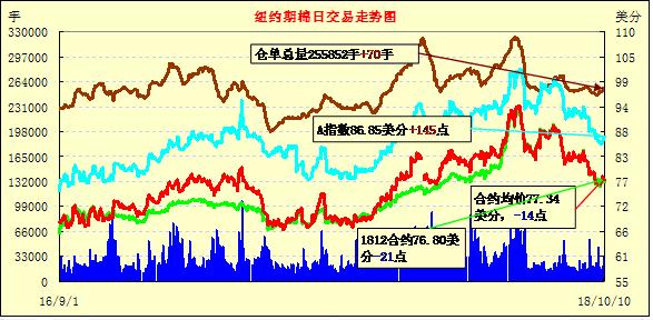 10月10日紐約期棉市場(chǎng)漲跌互現(xiàn)。1812合約結(jié)算價(jià)76.80美分,跌21點(diǎn);1903合約結(jié)算價(jià)78.04美分,跌3點(diǎn);1905合約結(jié)算價(jià)78.86美分,跌3點(diǎn)。當(dāng)日12月合約平穩(wěn)開(kāi)盤(pán),因缺乏有利支撐,開(kāi)盤(pán)后交易重心下行,低點(diǎn)處買(mǎi)盤(pán)發(fā)力,市場(chǎng)受支撐走高,后至收盤(pán)處維持震蕩態(tài)勢(shì),最終以小幅下跌收盤(pán)。颶風(fēng)Michael于當(dāng)?shù)貢r(shí)間周三在弗羅里達(dá)半島登陸,登陸強(qiáng)度接近5級(jí),風(fēng)速達(dá)249千米/小時(shí)。據(jù)悉,此次颶風(fēng)強(qiáng)度為弗羅里達(dá)半島同月份歷史最強(qiáng),為全美自1954年以來(lái)同月份最強(qiáng)。颶風(fēng)最后將轉(zhuǎn)向東北方向入侵喬治亞地區(qū),將帶來(lái)狂風(fēng)和強(qiáng)降雨。外圍美元指數(shù)下跌,玉米、大豆和小麥期貨下跌。周三美股三大股指全線(xiàn)下挫,均出現(xiàn)較大跌幅。