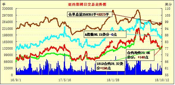 10月12日紐約期棉市場漲勢延續(xù)。1812合約結(jié)算價(jià)78.37美分,漲156點(diǎn);1903合約結(jié)算價(jià)79.55美分,漲138點(diǎn);1905合約結(jié)算價(jià)80.41美分,漲138點(diǎn)。其他合約上漲35-133點(diǎn)不等。當(dāng)日12月合約小幅高開,開盤后交易重心維持上行態(tài)勢,后維持在77.50-78.00美分區(qū)間窄幅震蕩運(yùn)行,美棉出口周報(bào)發(fā)布后,良好數(shù)據(jù)支撐市場走高,高點(diǎn)處賣盤入場,交易重心有所回落,至收盤處雖經(jīng)歷幾次震蕩,但受多因素支撐,以大幅上漲收盤。據(jù)美國農(nóng)業(yè)部(USDA),9.27-10.4日一周美國凈簽約出口2018/19年度陸地棉22226噸(含新簽約41504噸,另取消19278噸前期訂單),較前一周增加3.5倍,較近4周平均增加44%;裝運(yùn)2018/19年度陸地棉47624噸,較前一周增加16%,較近4周平均增加38%。凈簽約本年度皮馬棉2903噸;裝運(yùn)皮馬棉227噸。凈簽約出口2019/20年度陸地棉32409噸,較前一周增加57%。颶風(fēng)Michael強(qiáng)勢過境影響,據(jù)估計(jì)或?qū)⒔o東南棉區(qū)造成近22萬噸的損失。同時(shí),據(jù)外媒消息,土耳其釋放關(guān)押近兩年的美國牧師,市場普遍認(rèn)為這是美土關(guān)系開始緩和的信號,將有利于促進(jìn)美棉出口。外圍美元指數(shù)上漲,小麥、玉米和大豆期貨上漲。周五美股齊收漲,納指漲幅逾2%。