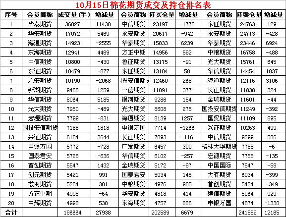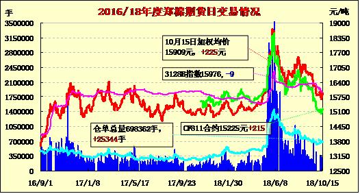 10月15日隔夜鄭棉沖高回落,今日早盤區(qū)間震蕩,日線形成小陰線。日內近月成交量變化不大,遠月成交溫和放大,持倉量增加。基本面情況:隨著熱帶風暴Sergio向西德州移動,上周末期間該區(qū)域預計將出現(xiàn)降雨天氣,氣溫將降低,至周一降雨量可能將超過2.5厘米。本年度至今德州高原地區(qū)棉區(qū)已經(jīng)先后經(jīng)歷了干旱、不利降雨以及低溫等不利天氣影響。降雨天氣使戶外作業(yè)受阻,因此西德州部分棉區(qū)棉花采摘進度緩慢。