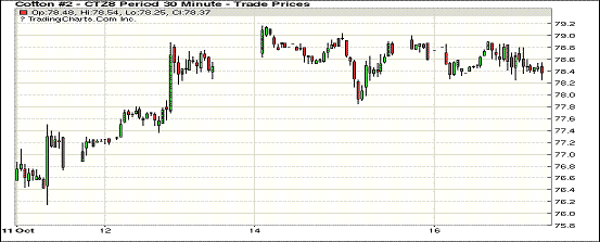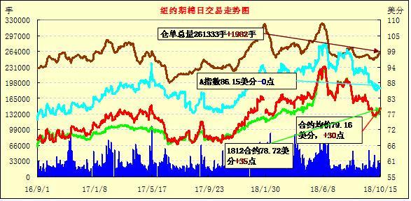10月16日紐約期棉市場近跌遠(yuǎn)漲。1812合約結(jié)算價(jià)78.33美分,跌39點(diǎn);1903合約結(jié)算價(jià)79.78美分,跌6點(diǎn);1905合約結(jié)算價(jià)80.65美分,不變。其他合約上漲2-12點(diǎn)不等。當(dāng)日12月合約小幅高開,開盤后因缺乏有利支撐交易重心下行,低點(diǎn)處買盤發(fā)力,市場受支撐小幅走高,后受獲利了結(jié)盤壓力交易重心下行,至收盤處雖經(jīng)歷幾次震蕩,因支撐因素不足,最終以小幅下跌收盤。由于颶風(fēng)Michael對棉花產(chǎn)量和質(zhì)量的影響仍處于定損中,其中以喬治亞州為甚,尚未有具體數(shù)據(jù)公布。目前市場普遍持觀望態(tài)度,現(xiàn)貨銷售進(jìn)度減慢。另,美國中期選舉臨近,有分析指出最終選舉結(jié)果對中美貿(mào)易戰(zhàn)的走向?qū)⑵鸬椒浅V匾挠绊?。外圍美元指?shù)上漲,小麥、玉米和大豆期貨下跌。周二美股齊上漲,三大股指均漲勢收盤。
