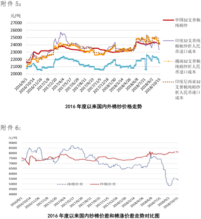 國內(nèi)棉價或持續(xù)低迷。國家統(tǒng)計局最新數(shù)據(jù)顯示,我國前三季度GDP增速為6.7%,分季度看,一季度同比增長6.8%,二季度增長6.7%,三季度增長6.5%。1-9月規(guī)模以上工業(yè)增加值同比增長5.8%,增速較去年同期放緩0.3%,其中紡織工業(yè)增加值同比增加0.9%,增速較上年同期放緩3.4%?;久娣矫妫刂?0月19日,全國新棉采摘進度為59.8%,同比下降5.2%,累計交售籽棉折皮棉243萬噸,同比減少58萬噸。本周新疆降溫降雪,影響后續(xù)新棉采摘質(zhì)量,受鄭棉走弱影響,新棉收購價格穩(wěn)中有降,目前新疆籽棉收購價格5.7-6.1元/公斤(衣分40%),3128級皮棉主流報價在15700-16300元/噸,皮棉現(xiàn)貨銷售進度緩慢,下游市場持續(xù)走弱,棉紗降價促銷,新增訂單減少。隨著新棉增產(chǎn)預(yù)期走強,下游消費信心不足,市場對2018年度國內(nèi)供需缺口預(yù)期有所減弱,短期內(nèi),國內(nèi)棉價或持續(xù)低迷,貿(mào)易摩擦反復(fù)增加行情的不確定性。