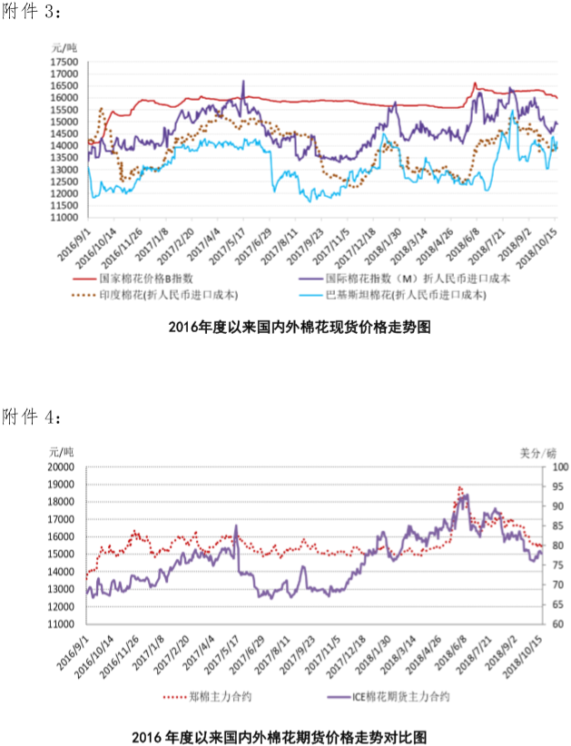 本周,中美首腦可能會晤消息,緩解市場恐慌情緒,加上美國颶風(fēng)“邁克爾”影響,國際棉花價格有所上漲。10月15-19日,紐約棉花期貨主力合約結(jié)算價78.19美分/磅,較上周上漲0.88美分/磅,漲幅1.14%;代表進口棉中國主港到岸均價的國際棉花指數(shù)(M)為86.50美分/磅,較上周上漲1.83美分/磅,漲幅2.16%,折人民幣進口成本14927元/噸,較上周上漲307元/噸,漲幅2.1%。內(nèi)外棉價差1113元/噸,較上周縮小374元/噸。(詳見附件1)