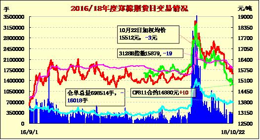10月22日隔夜鄭棉盤整,今日早盤沖高后調(diào)整,隨后窄幅震蕩直至收盤,日線形成小陽線。日內(nèi)成交量萎縮,持倉(cāng)量近減遠(yuǎn)增。基本面情況:海關(guān)總署最新數(shù)據(jù)顯示,2018年9月,我國(guó)出口紡織品服裝約266.09億美元,同比增加12.04%,環(huán)比減少1.64%。2018年1-9月,我國(guó)累計(jì)出口紡織品893.67億美元,同比增加10.12%;累計(jì)出口服裝1192.65億美元,同比增加0.53%。