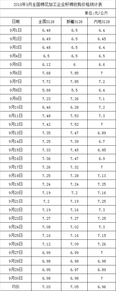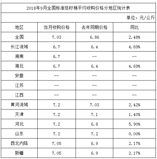 9月,全國標(biāo)準(zhǔn)級籽棉平均收購價7.03元/公斤,同比上漲2.48%。分區(qū)域看,新疆平均收購價7.05元/公斤,同比上漲2.17%;長江流域6.70元/公斤,同比上漲4.69%;黃河流域7.20元/公斤,同比上漲2.42%。新疆開秤價7.30元/公斤,較去年同期高0.20-0.30元/斤。
