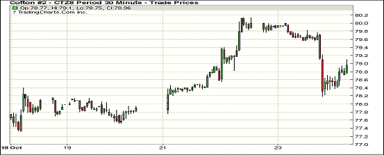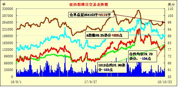 10月23日紐約期棉市場(chǎng)全面收跌。1812合約結(jié)算價(jià)78.99美分,跌103點(diǎn);1903合約結(jié)算價(jià)80.70美分,跌75點(diǎn);1905合約結(jié)算價(jià)81.69美分,跌70點(diǎn)。其他合約下跌7-66點(diǎn)不等。當(dāng)日12月合約小幅低開,因缺乏有利支撐,開盤之后出現(xiàn)小幅下行,在79.40-79.80美分區(qū)間窄幅震蕩運(yùn)行,后賣盤入場(chǎng),交易重心承壓迅速大幅走低,至當(dāng)日低點(diǎn)78.18美分處買盤入場(chǎng),市場(chǎng)受支撐小幅上行,但無(wú)力扭轉(zhuǎn)前期跌勢(shì),最終仍以大幅下跌收盤。根據(jù)美國(guó)農(nóng)業(yè)部(USDA)最新發(fā)布的美棉生長(zhǎng)數(shù)據(jù),東南棉區(qū)喬治亞州棉株偏差比例仍處于高位,阿拉巴馬片產(chǎn)比例較前一周有所增加。雖然颶風(fēng)Michael使東南棉區(qū)遭受重創(chuàng),但隨著各種預(yù)計(jì)數(shù)據(jù)的出現(xiàn),此消息已基本被市場(chǎng)消化,因此未使期棉市場(chǎng)出現(xiàn)大波瀾。外圍美元指數(shù)下跌,大豆期貨下跌,小麥和玉米期貨上漲。美股周二收盤,三大股指齊下挫。