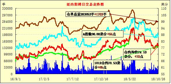 10月26日紐約期棉市場漲勢延續(xù)。1812合約結(jié)算價78.53美分,漲85點(diǎn);1903合約結(jié)算價79.82美分,漲86點(diǎn);1905合約結(jié)算價80.81美分,漲67點(diǎn)。其他合約上漲9-50點(diǎn)不等。當(dāng)日12月合約高位開盤,因缺乏有利支撐,開盤后交易重心下行,至當(dāng)日低點(diǎn)77.11美分處買盤發(fā)力,市場受支撐走高,至收盤維持上漲態(tài)勢,最終維持前一日上漲趨勢。據(jù)悉,颶風(fēng)Michael的定損報告尚未公布,但據(jù)有關(guān)保險公司人士稱,喬治亞州損失慘重,多個面棉區(qū)被全部損毀,市場普遍觀望11月美國農(nóng)業(yè)部(USDA)月度供需平衡表是否會對美國棉花產(chǎn)量預(yù)期進(jìn)行調(diào)整。此外,西德州近期的頻繁降雨也引發(fā)市場持續(xù)關(guān)注。外圍美元指數(shù)上漲,大豆、小麥和玉米期貨下跌。美股周五震蕩收跌。