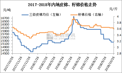 本年度新花上市時(shí)間,鄭棉期貨卻持續(xù)下跌,加重市場(chǎng)看空氛圍。2018年8月31日鄭棉主力1901合約收盤價(jià)16695元/噸;10月26日收盤價(jià)為15060元/噸。不到2個(gè)月時(shí)間鄭棉主力下跌1635元/噸,跌幅達(dá)9.79%。令業(yè)者信心不足,情緒低迷蔓延。